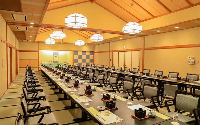 和風のたたずまいの宴会場は81畳の大宴会場「甲斐路」、